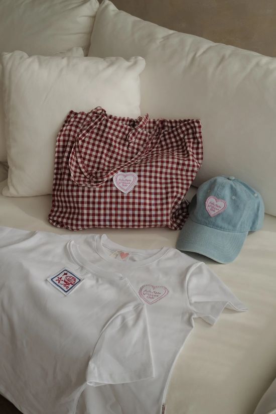A little like an old-school spring day — sunny, easy, and a bit nostalgic. 有點像那種老派的春天日子,有陽光,很輕鬆,還帶一點熟悉感。一套經典的春日日常,一件白T、一頂牛仔帽, 揹上那個有小小愛心的紅白格紋托特包。